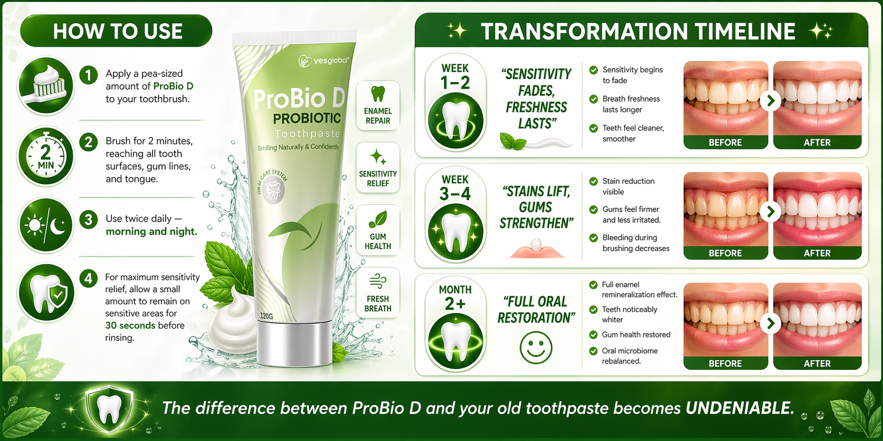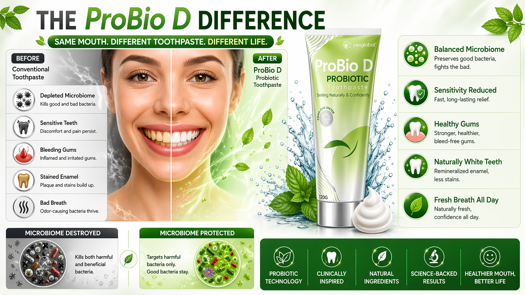 Transform your daily brushing into a ritual of renewal. ProBio D goes beyond ordinary toothpaste, bringing you fresher breath, a brighter smile, and the confidence of balanced oral health. Gentle yet powerful, it’s crafted to support sensitive teeth and gums while giving you the clean, refreshing finish your smile deserves.