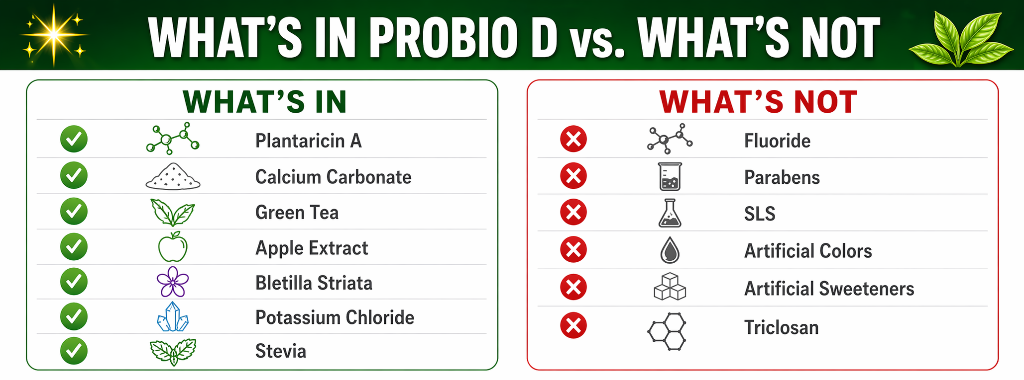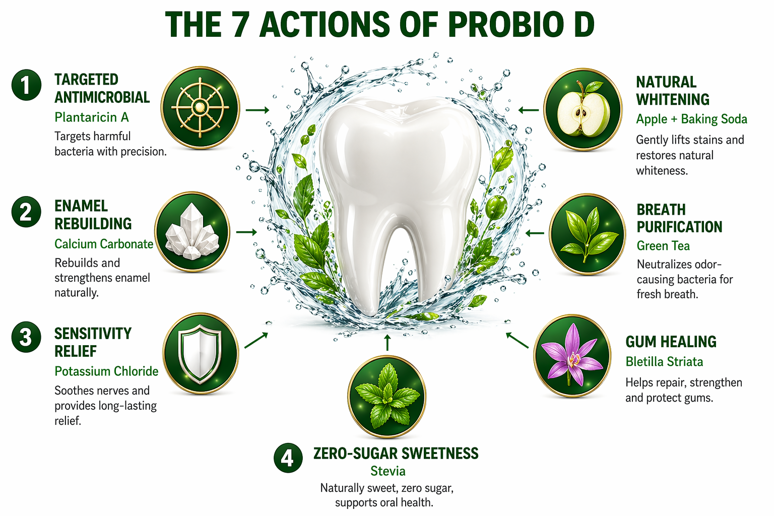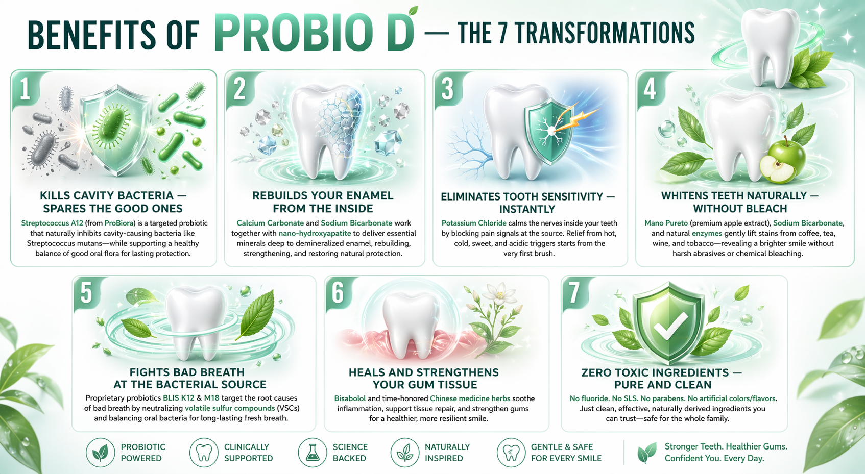 Backed by probiotic science, Plantaricin A works to balance the oral microbiome, while natural allies like Malus Pumila extract and Bletilla Striata extract help soothe, protect, and refresh. With the gentle polishing action of calcium carbonate and the neutralizing power of sodium bicarbonate, every brush leaves your teeth smooth, bright, and cared for—without fluoride, parabens, or SLS. Incorporated with Plantaricin A, Malus Pumila Extract, Sodium Bicarbonate, Calcium Carbonate, and Bletilla Striata Extract