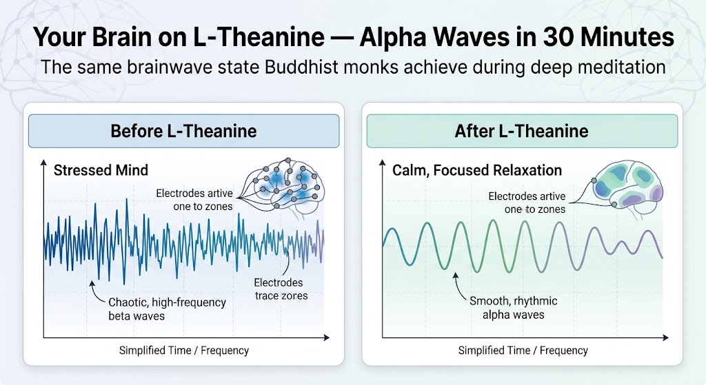 What it does to your body: Within 30–60 minutes of ingestion, L-Theanine measurably increases alpha brain wave production — the brainwave frequency associated with calm, focused relaxation, meditation, and the transition into sleep. It simultaneously increases GABA, serotonin, and dopamine levels while reducing cortisol. The effect is best described as "calm alertness" — you feel relaxed but not drowsy, peaceful but not sedated. At night, this alpha-wave state smooths the transition into deep NREM sleep.