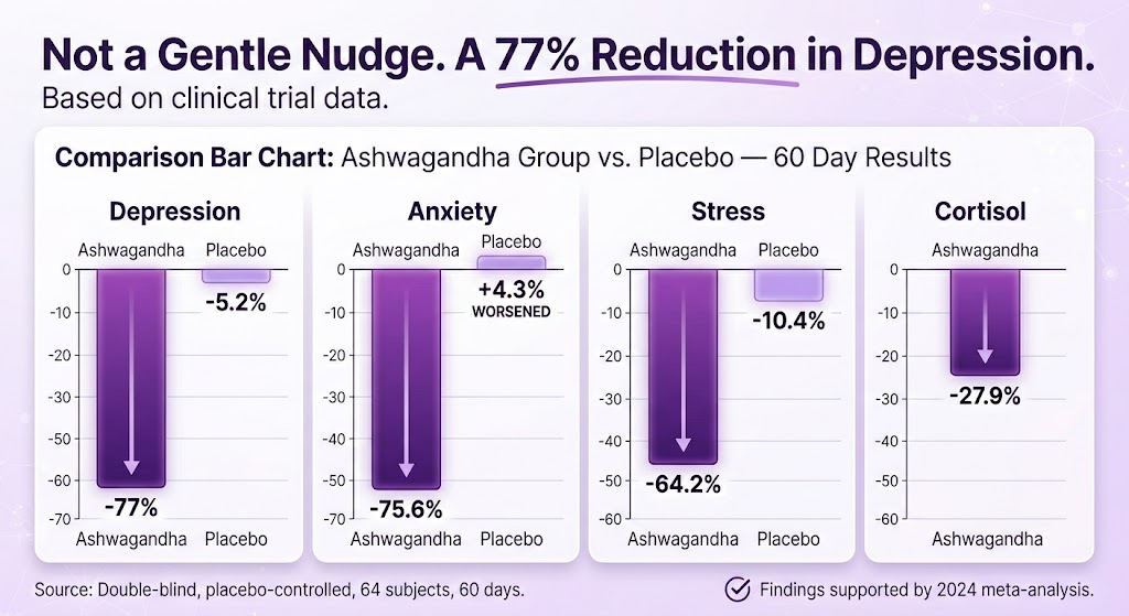 The crazy fact: In direct clinical comparisons, Ashwagandha has performed comparably to certain prescription anxiolytics and antidepressants — but without the side effects, without the dependency risk, and without the withdrawal symptoms. One meta-analysis described it as having "promising potential as a natural intervention for stress and anxiety management." No prescription pad required.